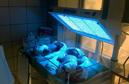 Một bé sinh non và một bé sinh thường đang chữa bệnh vàng da.